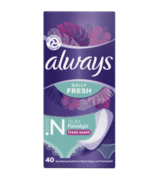 Blijf fris met Always Dailies Slim Multiform Fresh Inlegkruisjes bij vaginale afscheiding of als extra bescherming bij onregelmatige menstruatie. Ze zijn zo flexibel dat ze in al je ondergoed passen en zijn dunner dan één millimeter. De inlegkruisjes zijn ideaal voor dagelijks gebruik en geven jou een vertrouwd droog gevoel voor meer comfort en een frisse geur.