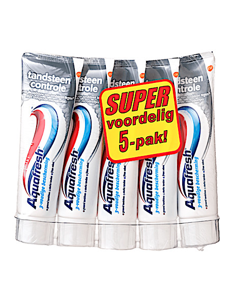 Aquafresh Tandsteen Control 5-pack Tandpasta helpt de vorming van tandsteen voorkomen. Aquafresh helpt plague op een milde wijze te verwijderen en vormt een beschermende laag om je tanden. Hierdoor wordt de opbouw van tandsteen tegen gegaan.