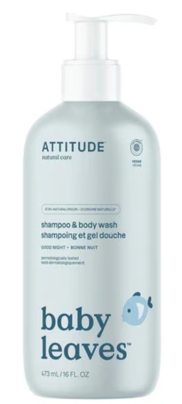 Baby leaves® ATTITUDE® 2-in-1 Shampoo en Body Wash - Good Night is perfect voor het zacht reinigen van de hoofdhuid en de gevoelige huid van uw kleintje. Het product is gemaakt met 97% natuurlijke ingrediënten¹, waaronder bosbessenbladextract, en bevat stoffen afkomstig van planten en mineralen die bekend staan om hun verzachtende werking op de droge huid. EWG VERIFIED®, veganistisch en dermatologisch getest, deze 2-in-1 formule met een zachte amandelgeur maakt het haar zijdezacht en de huid glad.