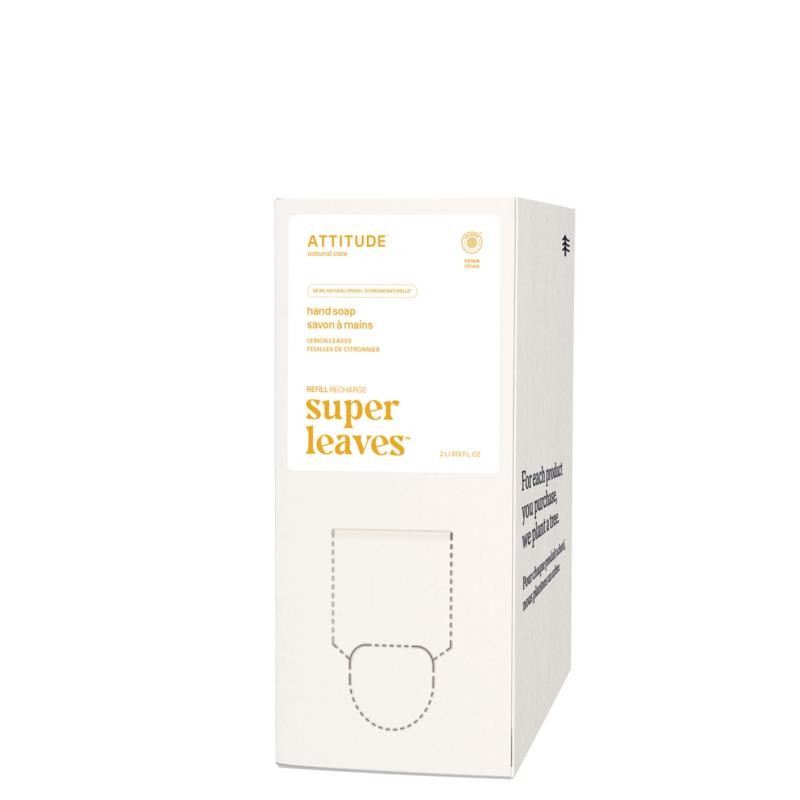 Was je handen met een zuiver geweten, wetende dat ATTITUDE’s Super leaves™ bulkverpakking handzeep met olijfbladeren vier maal meer product bevat met 77% minder plastic dan het equivalent in flessen. Onze vloeibare lichtgewicht handzeep die EWG VERIFIED™ en ECOLOGO gecertificeerd is, bevat extract van olijfbladeren en moringazaden om uw handen te reinigen en te herstellen. Gebruik de kracht van de natuur voor gezondere handen terwijl je op plastic afval bespaart. Navullen thuis was nooit zo eenvoudig!