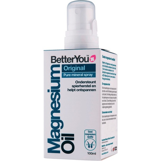BetterYou Magnesium Oil Original Spray ondersteunt spierherstel en helpt ontspannen. BetterYou Magnesium wordt gewonnen uit de Zechstein zeebodem uit een mijn 1,6 km onder de zeebodem. Het Zechstein magnesium bevindt zich daar al 250 miljoen jaar en is zeer zuiver en hoog geconcentreerd. De magnesium spray is op oliebasis en wordt op de huid gesprayd voor transdermale opname.