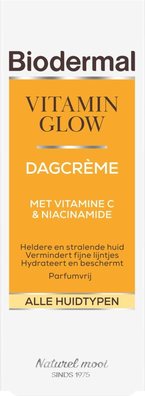 Biodermal Vitamin Glow Dagcrème met vitamine C en niacinamide (vitamine B3) zorgt voor een heldere, stralende en gladde huid. Het verstevigt de huid en vermindert fijne lijntjes. Beschermt de huid tegen schadelijke invloeden van buitenaf en hydrateert tot wel 24 uur. Voor een gevitaliseerde huid met een gezonde glow.