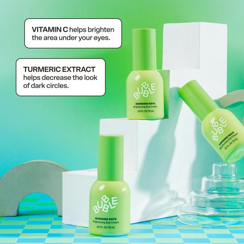 Voel je je moe, gestrest of inspiratieloos? Bubble kan dat niet oplossen, maar kan wel je ogen laten stralen met de Morning Rays Brightening Eye Cream! Deze lichte oogcrème verheldert de huid, verwijdert zwellingen en vermindert donkere kringen met een oogverblindend resultaat. Je mag dan moe zijn, maar je ogen zien er stralend uit.