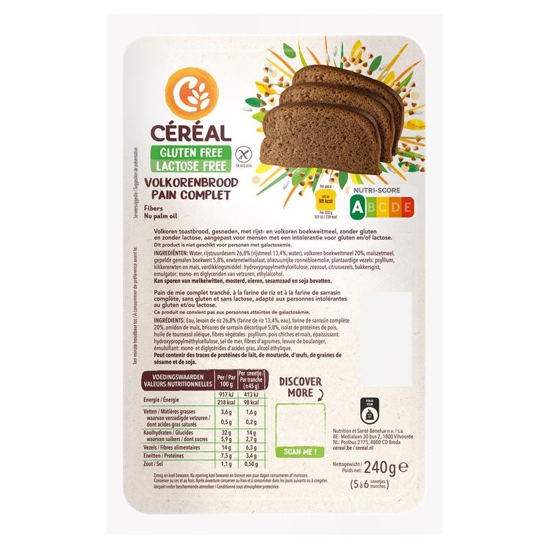 Cereal Volkorenbrood gluten- en lactosevrij (240 Gram)