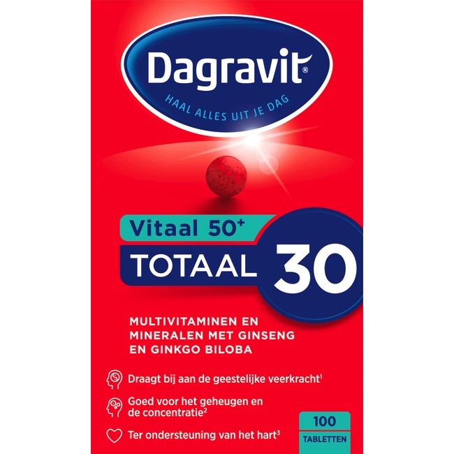 Dagravit Vitaal 50+ Tabletten zijn speciaal samengesteld voor de behoefte aan vitaminen en mineralen van de vijftigplusser. Gebruik de tabletten met ginseng en ginkgo biloba voor geestelijke veerkracht. De vitaminen B2, B6, B3 en vitamine C dragen bij tot vermindering van vermoeidheid en moeheid. Vitamine B1 ondersteunt de normale werking van het hart. De normale psychologische functies zoals geheugen en concentratie worden bevorderd door vitamine B8, B11 en vitamine C.
