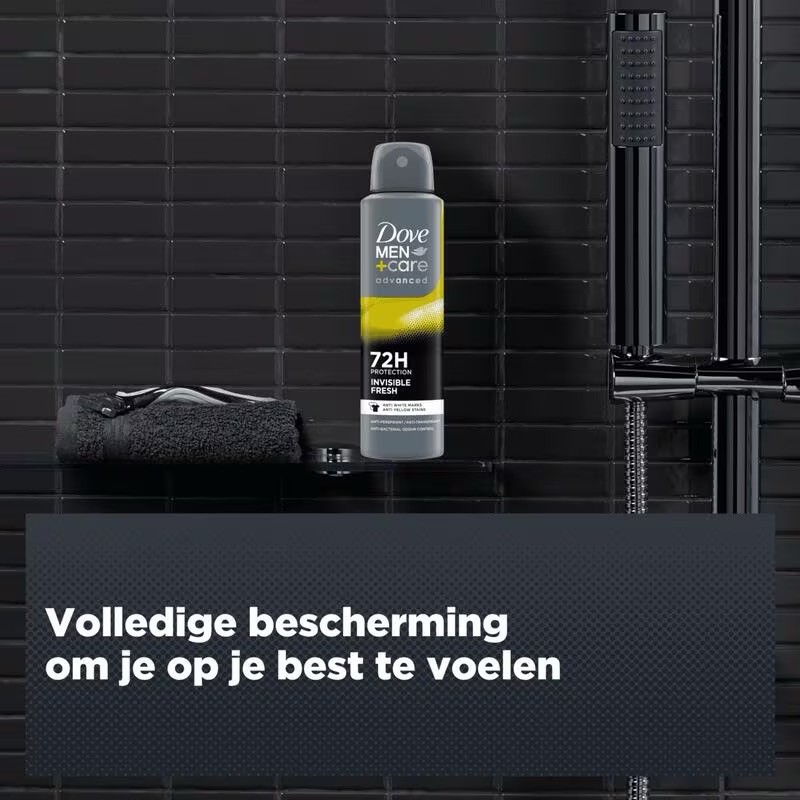 De Dove Men+Care Advanced Invisible Fresh Anti-Transpirant Deodorant Spray is ontworpen om vlekken te voorkomen en om je te beschermen tegen zweet en irritatie. Want het dragen van je favoriete kleding kan je het zelfvertrouwen geven om elke dag aan te kunnen. Daarom heb je een deodorant nodig die je kleding niet met gele of witte vlekken achterlaat. Warm weer en zweet zijn geen partij voor deze anti-transpirant spray. De formule met de revolutionare Triple Action Technologie beschermt tot 72 uur tegen zweet, geur en irritatie. Bovendien zorgt de frisse, energieke geur voor langdurig fris ruikende oksels. Dove Men+Care Advanced Invisible Fresh Anti-Transpirant Deodorant Spray helpt je je op je best te voelen. Deze niet-vlekkende anti-transpirant spray bevat tevens een 1/4 hydraterende crème om je huid te verzorgen. Huidirritatie door het gebruik van deodorant behoort tot het verleden want deze anti-transpirant zorgt voor gladde en gezond aanvoelende oksels. Je kleding beschermen: Deze niet-vlekkende anti-transpirant voor mannen is de oplossing tegen vlekken. Je hoeft je geen zorgen te maken over witte strepen en gele vlekken op je favoriete kleding. 72 uur bescherming: Laat zweet en geur je niet in de weg zitten als het buiten warm is. Deze mannelijke anti-transpirant spray is ontworpen om langdurige bescherming te bieden en je de hele dag een fris gevoel te geven waarop je kunt vertrouwen. Superieure verzorging: Deze anti-transpirant deodorant verzorgt ook je oksels. Verrijkt met 1/4 hydraterende crème, die de okselhuid hydrateert. Hierdoor voelt je huid de hele dag gehydrateerd en verzorgd aan.