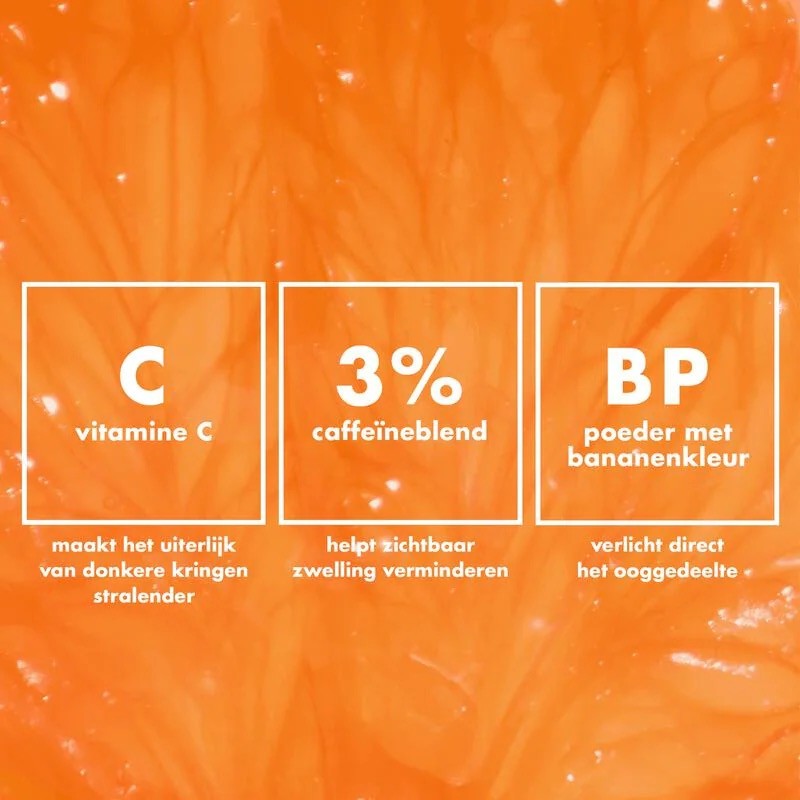 Verhelderende oogcrème verrijkt met vitamine C, banaan-getinte poeder en een 3% cafeïnemix om vermoeid ogende ogen nieuw leven in te blazen