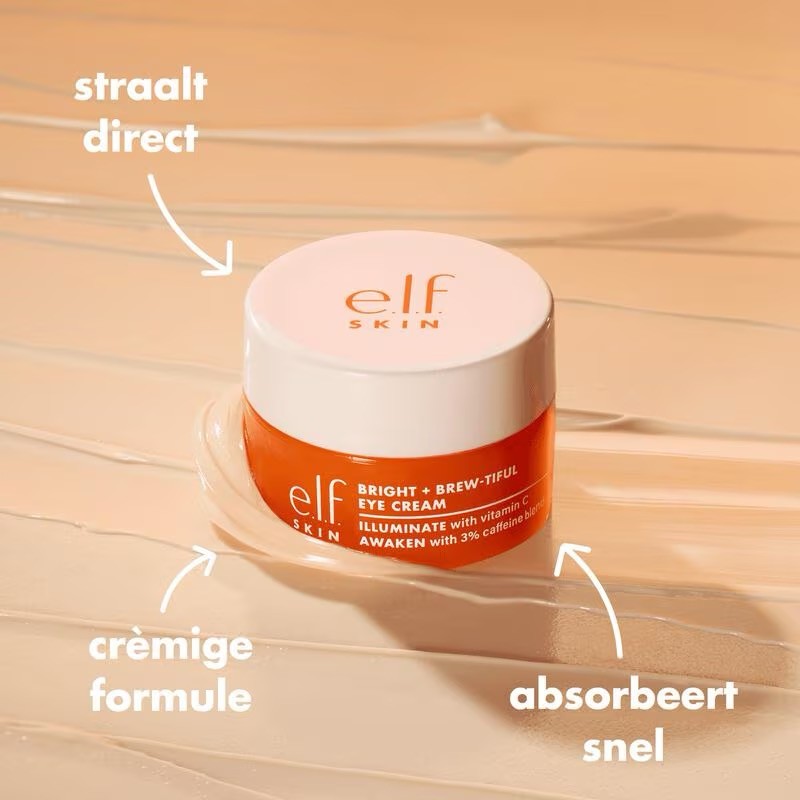 Word wakker met e.l.f. SKIN Bright + Brew-tiful Eye Cream—een verhelderende oogcrème die je ogen een uitgerust uiterlijk geeft. Aangedreven door vitamine C om donkere kringen zichtbaar te verminderen, een banaan-getinte poeder voor directe radiantie, en een 3% cafeïnemix om te ontzwellen; het is als een snelle shot eye-spresso wanneer je huid een boost nodig heeft. De lichte, verkoelende formule wordt snel opgenomen en laagjes naadloos onder concealer—zodat je eruitziet alsof je acht uur hebt geslapen (zelfs als dat niet zo is).