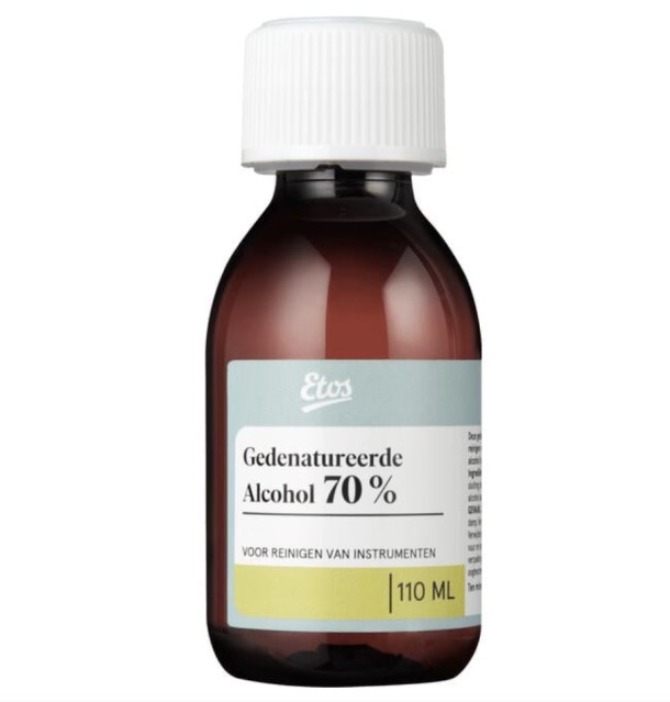 Gedenatureerde alcohol 70% kun je gebruiken voor het reinigen van je huid, instrumenten en oppervlakten. Gedenatureerde alcohol is ongeschikt gemaakt voor consumptie. Onderdeel van het kraampakket.