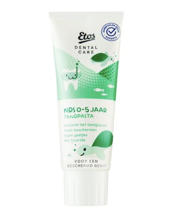 Etos KIDS tandpasta 0-5 jaar helpt tanden en kiezen te beschermen tegen gaatjes. Het fluoridegehalte van deze tandpasta is afgestemd op het gebit van kinderen tot 5 jaar.