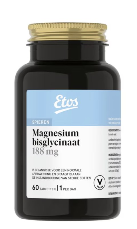 Etos Magnesiumbisglycinaat 188 mg is een voedingssupplement met magnesium, dat bijdraagt aan een normale spierwerking en het behoud van sterke botten. Magnesium ondersteunt daarnaast de energiestofwisseling. Met 1 tablet per dag krijg je een praktische aanvulling op je dagelijkse voeding. De verpakking bevat 60 tabletten, goed voor twee maanden gebruik. Een voedingssupplement is geen vervanging van een gevarieerde voeding en een gezonde levensstijl.
