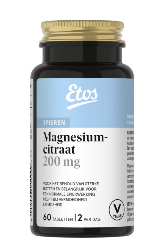 Met Etos Magnesiumcitraat 200 mg vul je eenvoudig je dagelijkse magnesiuminname aan. Magnesium draagt bij aan een normale werking van de spieren en helpt bij het behoud van sterke botten. Daarnaast ondersteunt magnesium de vermindering van vermoeidheid en draagt het bij aan een normaal energieniveau. De verpakking bevat 60 tabletten en is geschikt voor dagelijks gebruik. Een voedingssupplement is geen vervanging van een gevarieerde voeding en een gezonde levensstijl.