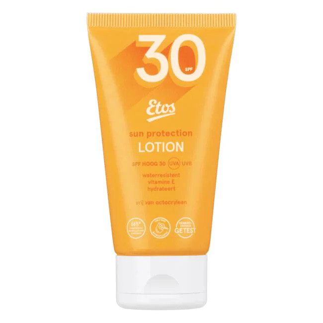Etos Sun Protection lotion SPF30 in miniverpakking biedt UVA- en UVB-bescherming en heeft een hydraterende werking op de huid.