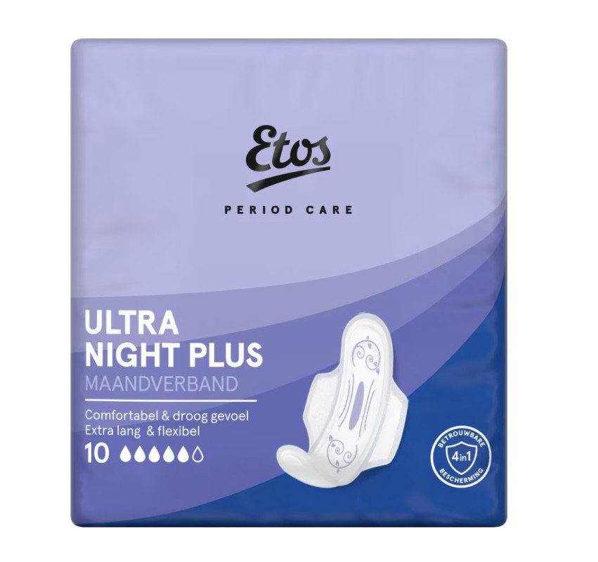 Ervaar zorgeloze nachten met Etos Ultra Maandverband Night Plus. Dit maandverband is speciaal gemaakt om jou extra bescherming te bieden in de nacht tijdens je menstruatie. Met een comfortabele pasvorm en uitstekende absorptie biedt het de zekerheid die je nodig hebt.
