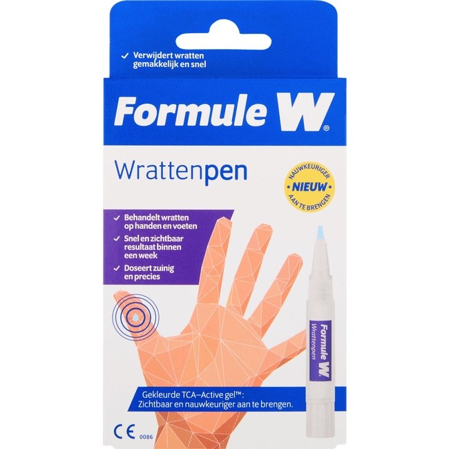 Formule W Wrattenpen is een nieuwe methode voor de behandeling en het verwijderen van gewone wratten (verruca vulgaris en verruca plantaris) op handen en voeten door middel van een penapplicator met een sterk geconcentreerde gel. Deze gel stimuleert de celvernieuwing, waardoor de huid vervelt. Op die manier zal nieuwe gezonde huid gevormd worden en zal de wrat krimpen en verdwijnen.