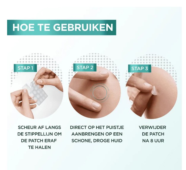 3. Verwijder na 8 uur. Tip: Werkt het beste op puistjes met een witte/gele kop. Verkrijgbaar in twee maten (10mm, 12mm) zodat het geschikt is voor alle puistjes.