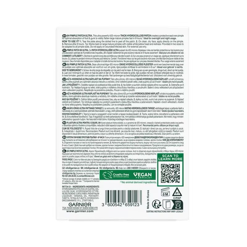 Ontdek Garnier PureActive Pimple Patch Ultra: deze ultra krachtige 420 micron dikke hydrocollïde patch vormt een beschermende laag over de puistjes voor optimale absorptie van vocht en vuil, om grote, rijpe puistjes zichtbaar te verminderen in 8 uur*. Ideaal voor gebruik 's nachts.