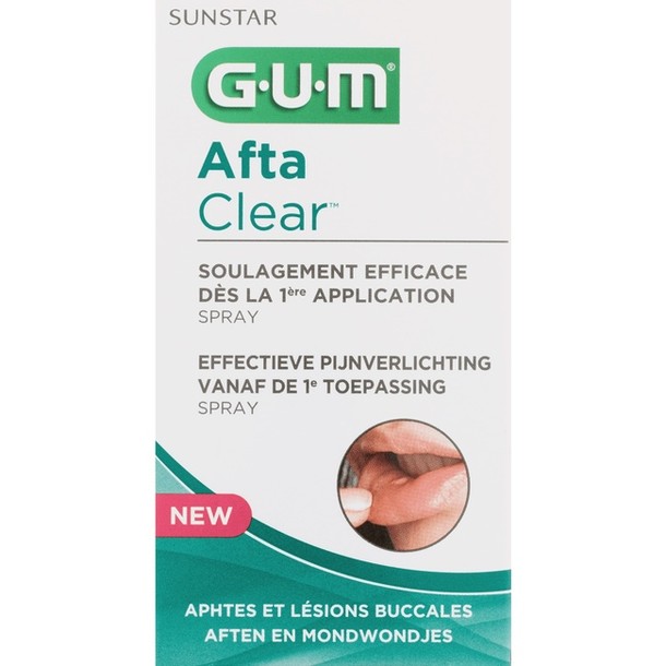 Gum Afta Clear Spray biedt een snelle en langdurige pijnverlichting bij aften, mondwondjes en brandblaartjes bij kinderen en volwassenen. De spray is geschikt voor direct behandelen van een plaatselijk wondje en bevordert een snel herstel. Gum Afta Clear Spray is gemakkelijk aan te brengen dankzij de lange hals en is ideaal voor onderweg.