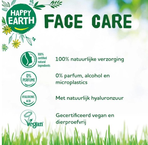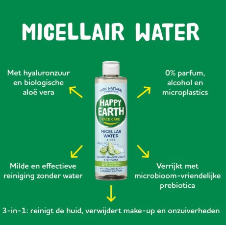 100% Natuurlijk Micellair Water 3-in-1: reinigt, verwijdert make-up en onzuiverheden Dit 100% natuurlijke micellair water reinigt je huid effectief in één stap. Het verwijdert make-up, vuil en onzuiverheden zonder de huid uit te drogen. Door de milde formule met hyaluronzuur en biologische aloë vera voelt je huid na gebruik fris, zacht en verzorgd aan. De toevoeging van prebiotica helpt je huid in balans te blijven, zelfs bij dagelijks gebruik. Voor een schone, frisse huid – zonder gedoe. Dit product is, net als alle andere producten van Happy Earth, gecertificeerd vegan en microplasticvrij. De verpakking is een fles van 100% gerecycled plastic en wij produceren al onze producten lokaal in Nederland met groene energie.