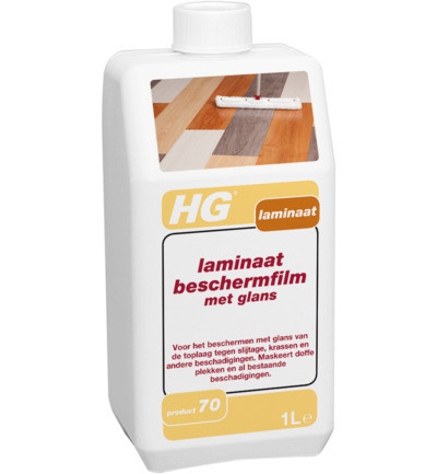 HG laminaat beschermfilm met glans (laminaat glans) (HG product 70) is een gemakkelijk aan te brengen vloeibare polymeer emulsie welke na droging een glanzende en flinterdunne, maar uiterst sterke beschermfilm vormt waardoor de toplaag van het laminaat wordt beschermd tegen slijtage, krassen en andere beschadigingen. Dit product maskeert tevens doffe plekken en al bestaande beschadigingen en geeft een anti-slip effect.