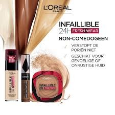 Ontdek de L'Oréal Paris Infaillible 32H Fresh Wear Foundation voor een egale, natuurlijke uitstraling tot 32 uur lang. * De verbeterde formule is verrijkt met SPF25 en vitamine C.** Dit laatste ingrediënt geeft de foundation een mooie stralende finish. De foundation heeft een hoge dekking en een luchtige formule. Daardoor voel je de foundation niet zitten op de huid. De formule is daarnaast non-comedogeen, dit houdt in dat het de poriën niet verstopt. Ideaal dus voor een gevoelige of onrustige huid.* Consumententest, 172 vrouwen** Vitamine C derivaa