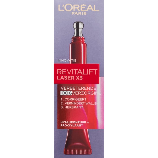 L'Oréal Paris Revitalift Laser X3 Oogverzorging is een product geïnspireerd op een laserbehandeling voor een zichtbaar jongere uitstraling. De oogverzorging met hyaloronzuur en pro-xylaan helpt bij het verminderen van diepe rimpels en laten de huid weer strakker, steviger en egaal worden.