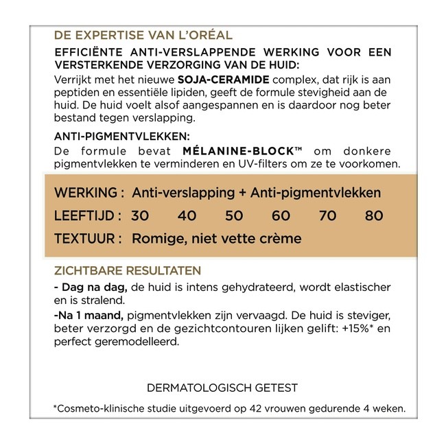 Op zoek naar de beste anti-rimpel dagcrème? Deze L Oréal Paris Age Perfect Dagcrème is een rijke en intensieve anti-aging huidverzorging die de huid een natuurlijke facelift geeft. De goede dagcrème zorgt ervoor dat de huid steviger wordt en extra elastisch aanvoelt. Na een maand zie je resultaat terug in een vollere en steviger ogende huid. De crème zorgt ervoor dat rimpels en pigmentvlekjes minder zichtbaar worden en is een ideale dagverzorging voor de huid vanaf 50 jaar en ouder of wanneer de huid behoefte heeft aan een intensieve anti-aging verzorging. De formule is verrijkt met sojapeptiden en mélanine-block.