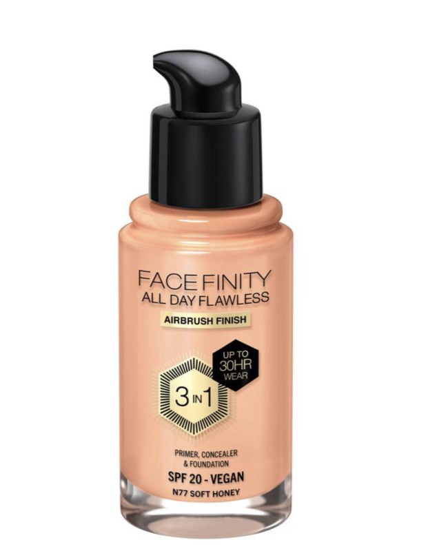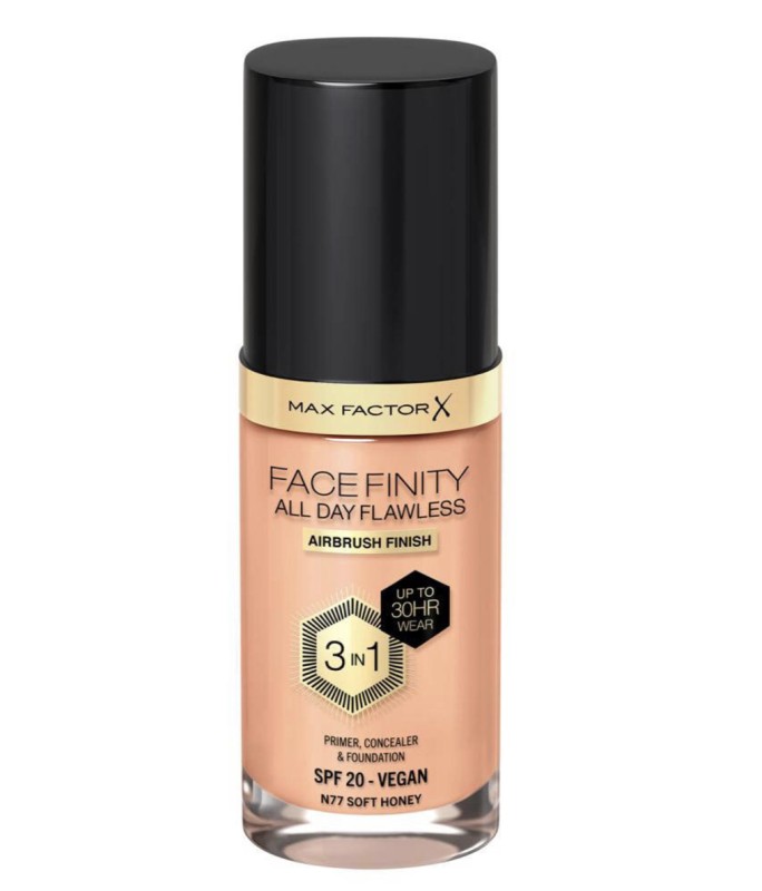Max Factor Facefinity All Day Flawless 77 Soft Honey 3 in 1 Foundation is een lichte drie in één foundation. De vloeibare foundation is een primer, foundation met SPF factor en concealer in één. De primer zorgt voor een goede basis, de concealer bedekt rode plekjes en de foundation zorgt voor een egale huid. De foundation voelt licht aan, matteert je huid en blijft de hele dag zitten.