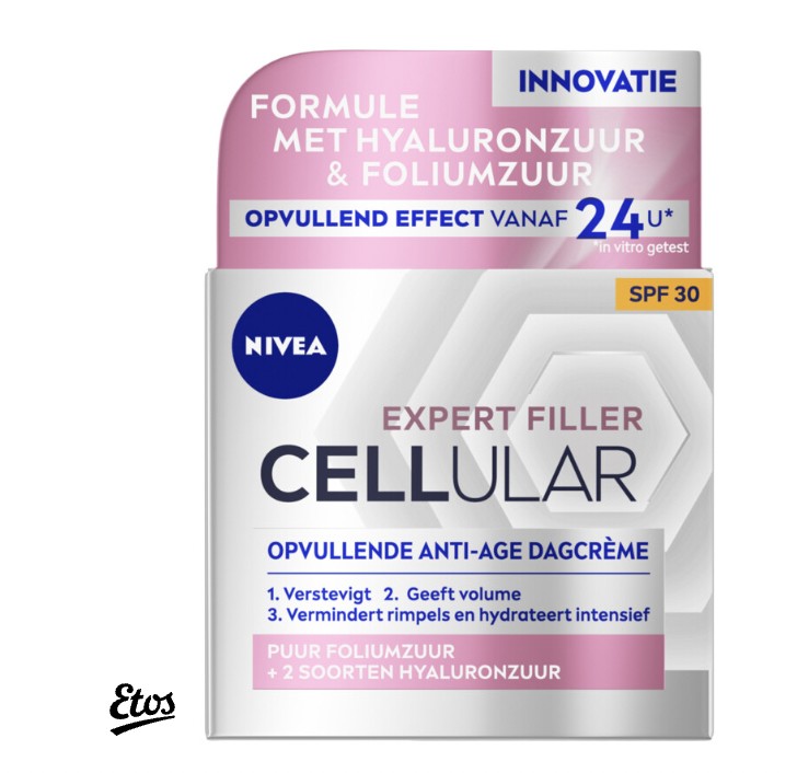NIVEA CELLular Anti-Age Dagcrème Extra Bescherming helpt dankzij de toevoeging van SPF 30 met UVA-en UVB de huid extra te beschermen tegen huidveroudering, celbeschadiging en pigmentvlekken veroorzaakt door zonlicht. De beschermende en verzorgende formule met de actieve ingrediënten Hyaluronzuur, Magnolia Extract en Creatine vermindert rimpels en versnelt het huideigen vernieuwingsproces bij regelmatig gebruik. De crème met lichte textuur absorbeert snel.