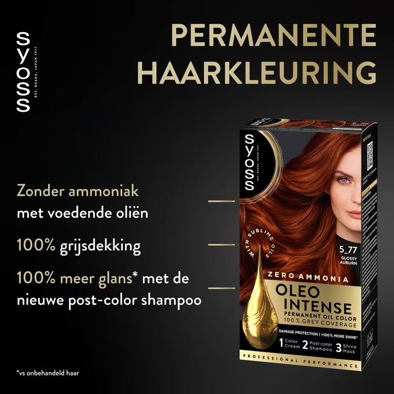 Syoss Oleo Intense 5-77 Koperrood is een permanente haarkleuring zonder ammoniak die meer biedt dan alleen kleur. De high performance formule met voedende oliën voedt en beschermt het haar tijdens het kleuren en zorgt voor een intens, langdurig kleurresultaat met 100% grijsdekking en extra glans. De warme koperrode tint is geschikt voor middenblond tot middenbruin haar. 1 Kleurcrème met oliën die het haar beschermt tijdens het kleuren, met rijke kleurpigmenten en een toonvast resultaat met 100% grijsdekking 2 Post-color shampoo die kleurresten zacht verwijdert, het haar glad maakt en mild is voor de hoofdhuid 3 Glansmasker dat het haar intens verzorgt voor sterker, gezond uitziend en zichtbaar glanzender haar