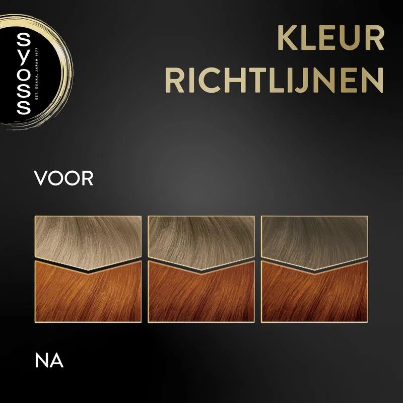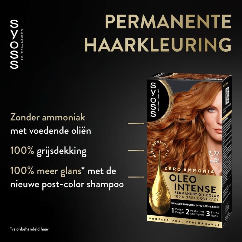 Syoss Oleo Intense 7-77 Koperblond is een permanente haarkleuring zonder ammoniak die meer biedt dan alleen kleur. De high performance formule met voedende oliën voedt en beschermt het haar tijdens het kleuren en zorgt voor een intens, langdurig kleurresultaat met 100% grijsdekking en extra glans. De warme koperblonde tint is geschikt voor lichtblond tot donkerblond haar. 1 Kleurcrème met oliën die het haar beschermt tijdens het kleuren, met rijke kleurpigmenten en een toonvast resultaat met 100% grijsdekking 2 Post-color shampoo die kleurresten zacht verwijdert, het haar glad maakt en mild is voor de hoofdhuid 3 Glansmasker dat het haar intens verzorgt voor sterker, gezond uitziend en zichtbaar glanzender haar
