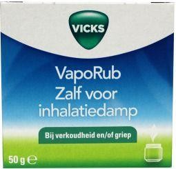 Vicks VapoRub is een zalf van meerdere vluchtige oliën en aromatische stoffen en werkt na inhaleren via de neus. Het inhaleren van dampen die vrijkomen door lichaamswarmte of door toevoeging van de zalf aan heet water (dampbad) wordt als verlichtend ervaren. Dit middel wordt gebruikt bij verkoudheid en/of griep.
