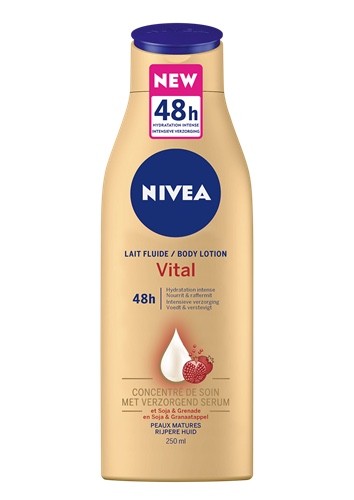 NIVEA's gepatenteerde formule is verrijkt met VERZORGEND SERUM , een unieke samenstelling van het huideigen hydraterende vermogen, verzorgende lipiden en voedende oliën. NIVEA® Vital Body Lotion bevat natuurlijke Soja Proteïnen en Granaatappelextract. De Body Lotion verstevigt en verbetert de elasticiteit van de huid. De huid is beter beschermt tegen uitdroging omdat er meer water in de huid wordt vastgehouden en verlies van vocht wordt verminderd. De rijke formule voedt de huid 48u lang intensief voor een heerlijk zachte huid De laatste testmethodes tonen aan dat de combinatie van de hoge kwaliteit ingrediënten van onze NIVEA body milks en lotions samen met het VERZORGENDE SERUM ervoor zorgen dat de formule diep in de huid trekt en 48 uur lang een voelbaar zachtere huid geeft.