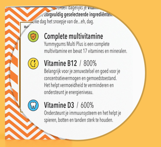 In Nederland is Yummygums Multi Plus de eerste gummievitamine die zoveel hoogwaardige voedingsstoffen bevat. Met 17 vitamines en mineralen is het een complete multivitamine voor jong en oud. Zo hoef je niet elke dag verschillende pillen te nemen maar krijg je alle belangrijke vitamines binnen met vier lekkere gummies (of twee voor kids). Je vergeet je vitamines nooit meer, omdat je dagelijks naar jouw snoepmomentje verlangt.