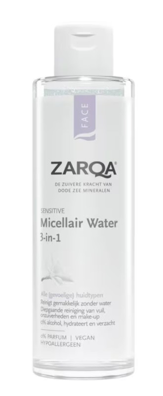 ZARQA Micellair water - met Dode Zee mineralen en aloë vera – heeft een 3-in-1 werking:het reinigt de huid, verwijdert make-up en onzuiverheden en helpt met het herstellen en kalmeren van de huid. Micellen zijn microscopisch kleine deeltjes die als een magneet vuil, make-up en overtollig talg omsluiten; het gebruik van water, hard wrijven en afspoelen is hierdoor niet nodig. Aloë Vera en provitamine B5 kalmeren de huid en helpen de vochtbalans van de huid herstellen. ZARQA Micellair water bevat geen parfum, geen alcohol en geen andere irriterende stoffen als zeep en is zo mild dat het zelfs kan worden gebruikt op de gevoelige huid rondom de lippen en ogen. De huid voelt na gebruik gehydrateerd, schoon en niet trekkerig aan.